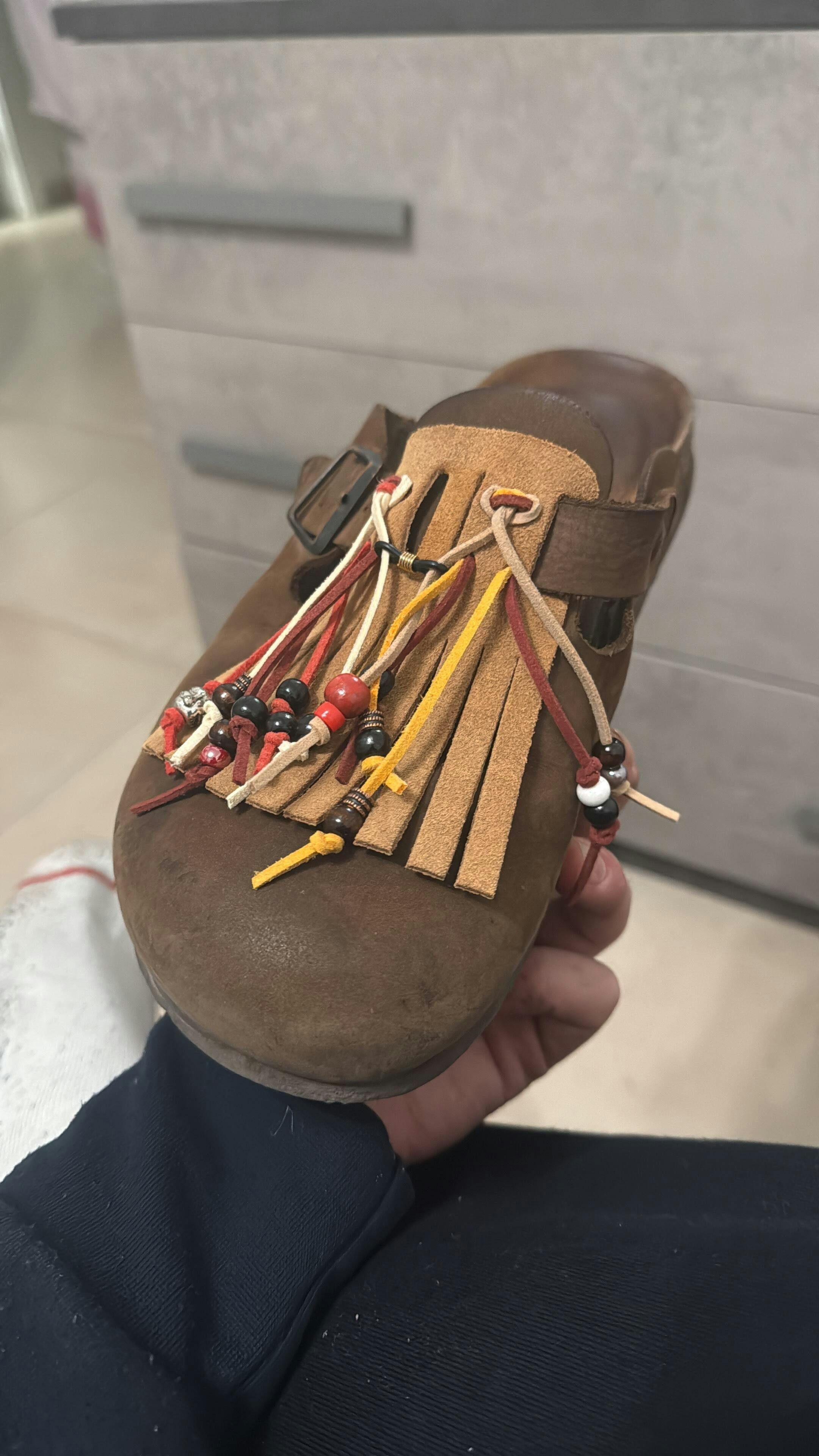 Accessorio in pelle disponibile in vari colori da inserire nel cinturino del tuo sabot per renderli ancora più cool! Le perline e o i laccetti possono essere diversi.