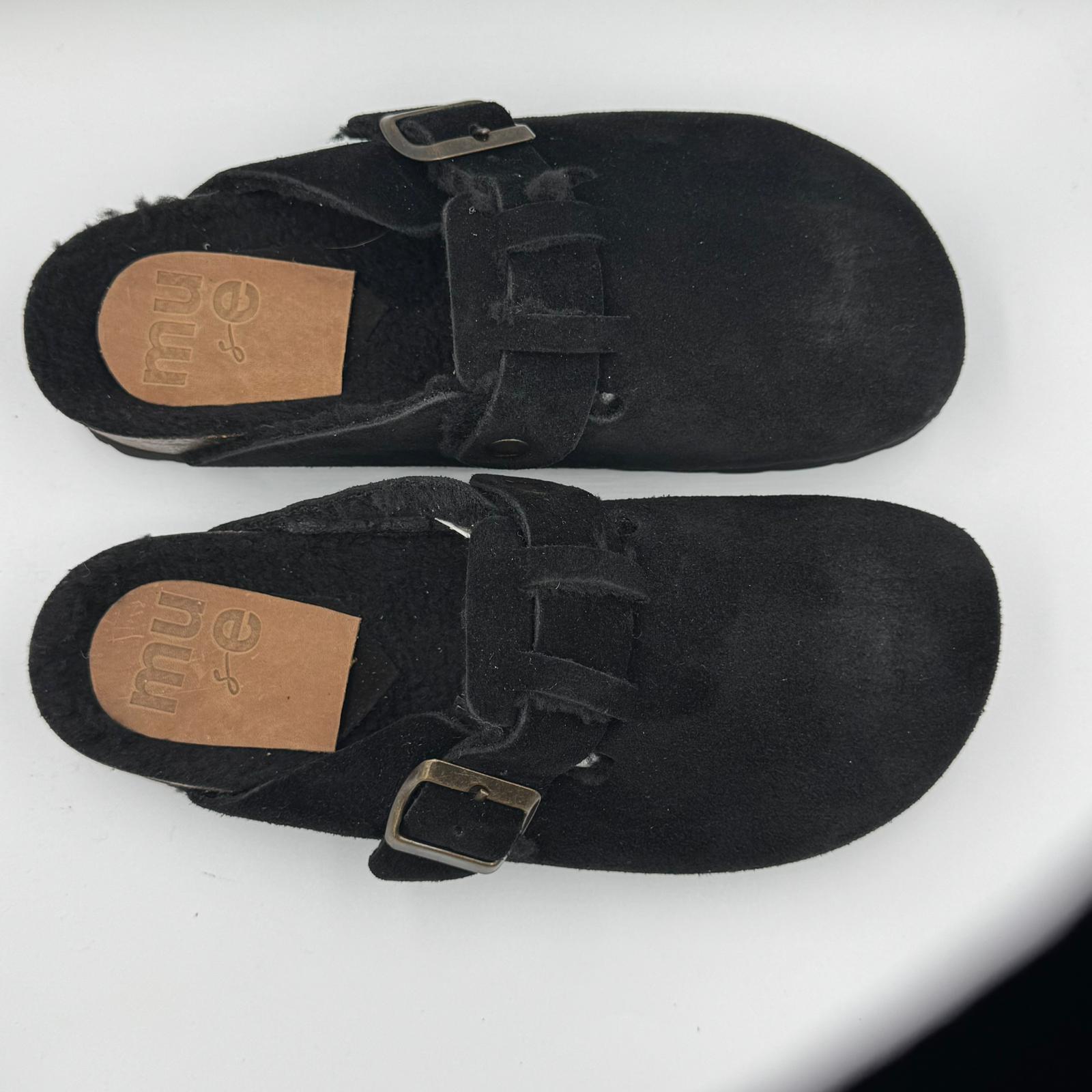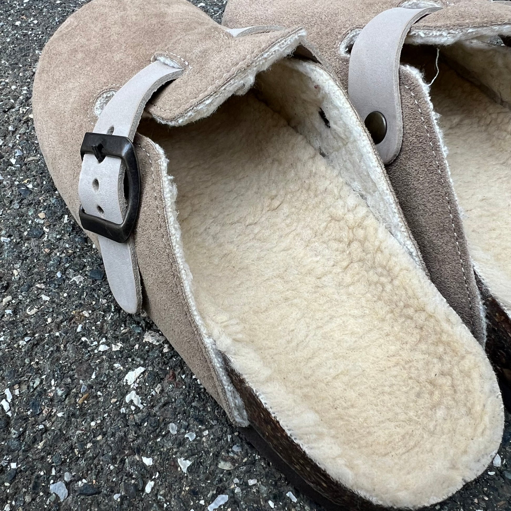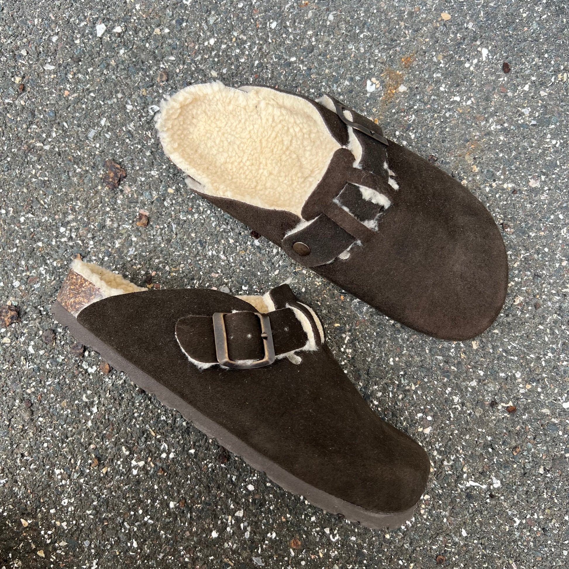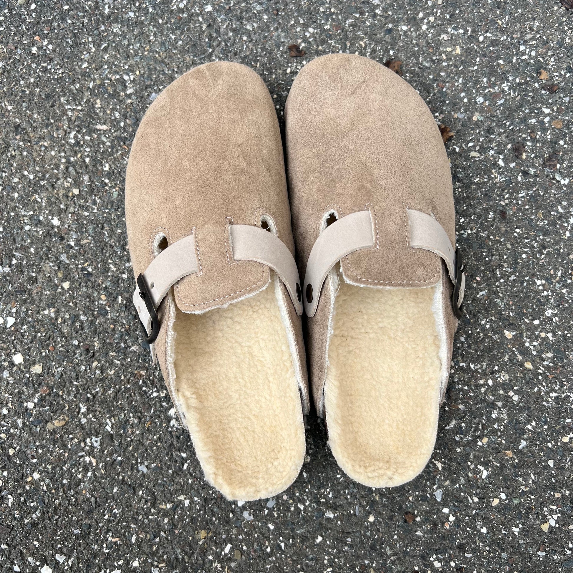 Sabot in crosta di camoscio realizzati artigianalmente dallo stile minimal con plantare anatomico in sughero, fibbia regolabile e imbottitura in pelliccia sintetica.
