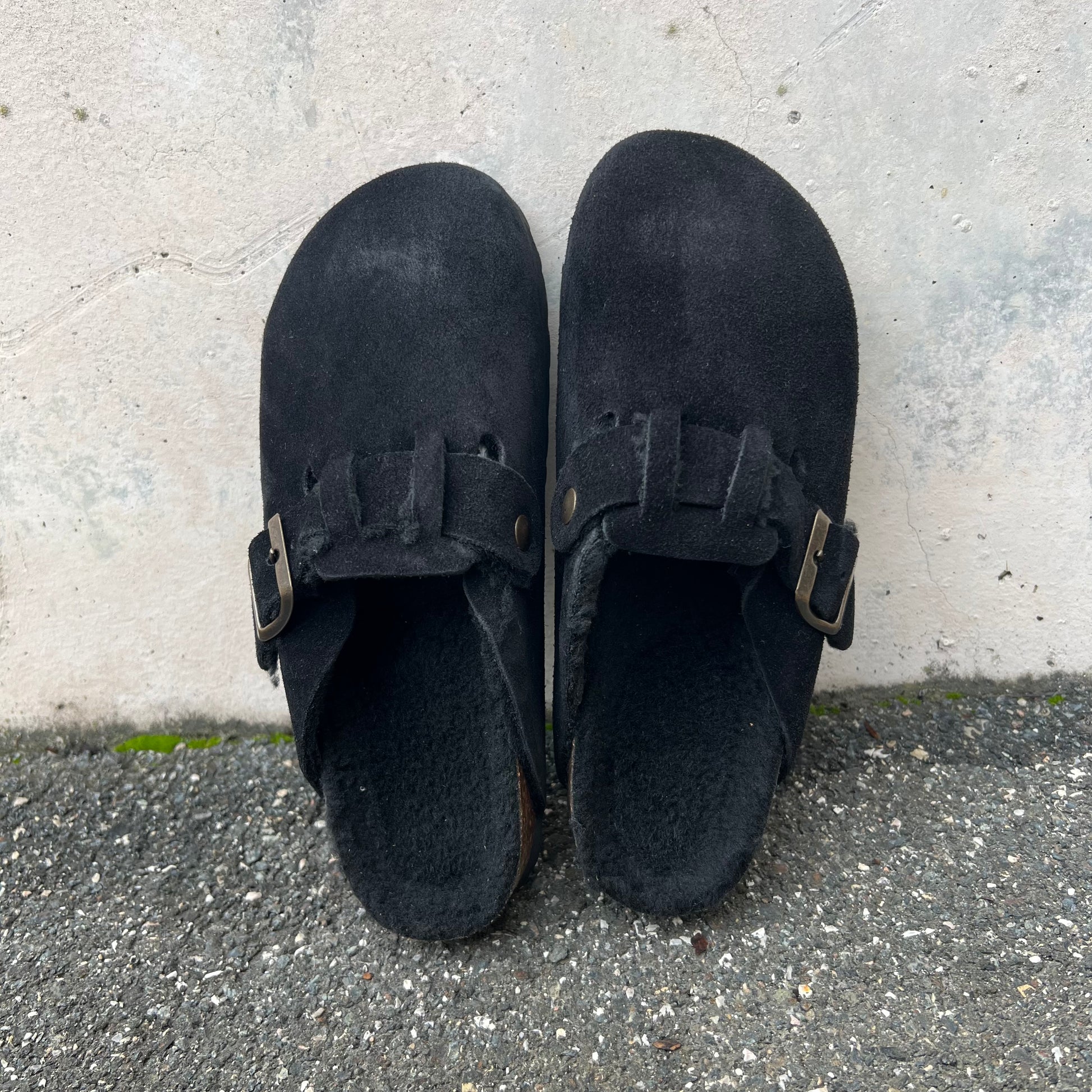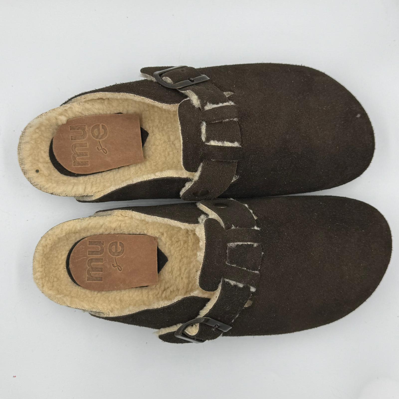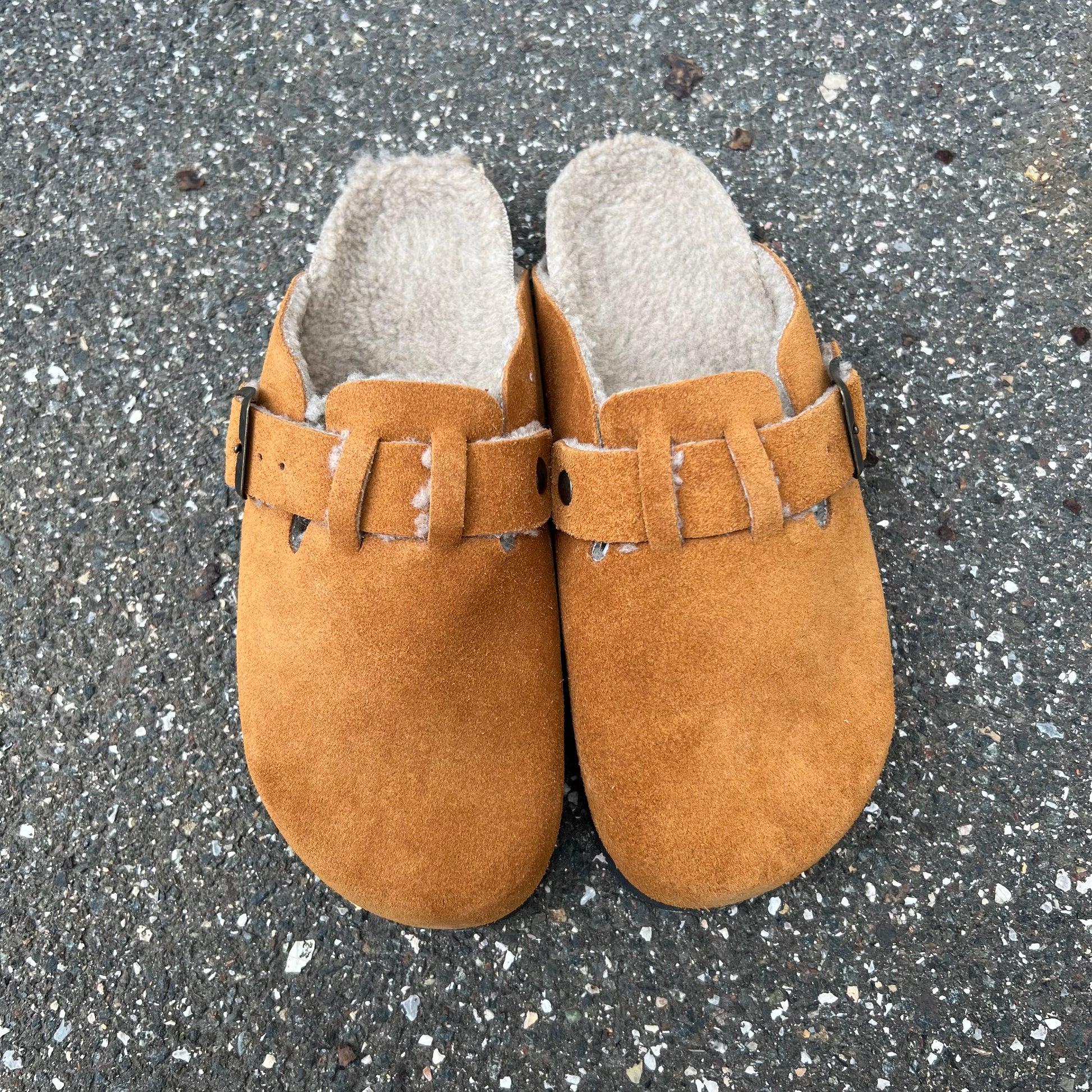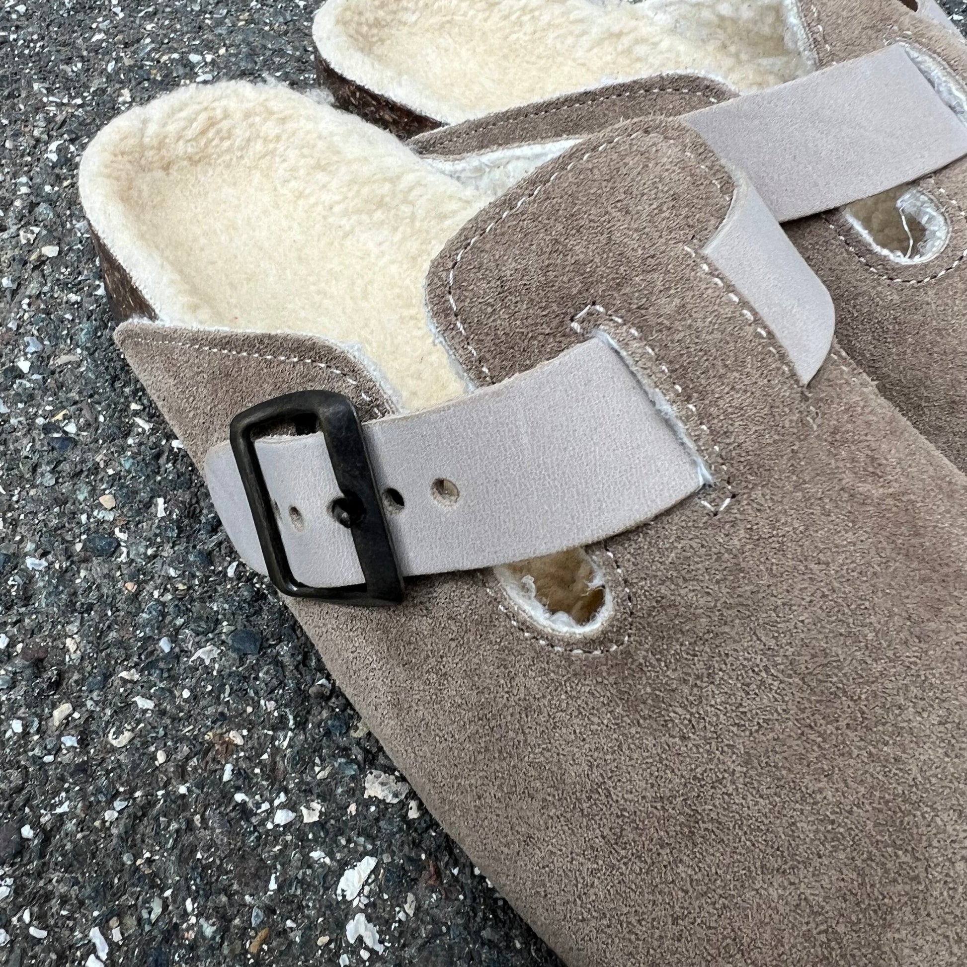 Sabot in crosta di camoscio realizzati artigianalmente dallo stile minimal con plantare anatomico in sughero, fibbia regolabile e imbottitura in pelliccia sintetica.